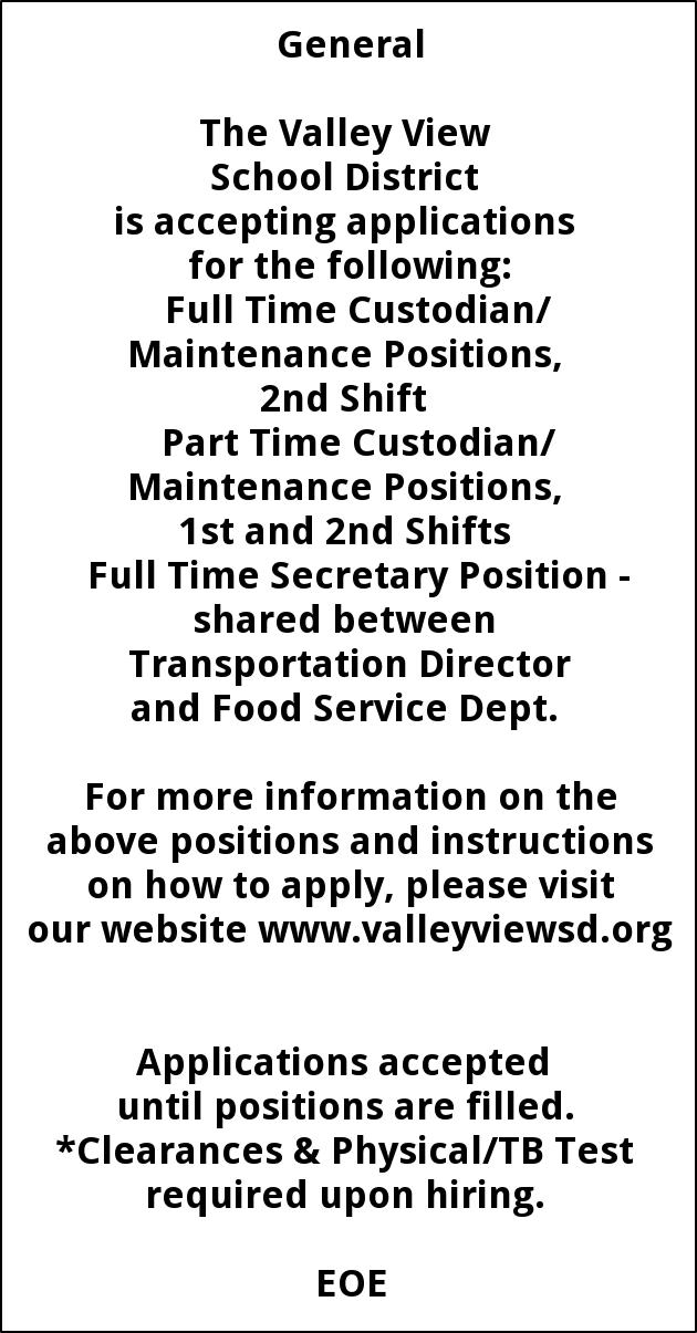 For more information on the above positions and instructions on how to apply, please visit our website www.valleyviewsd.org