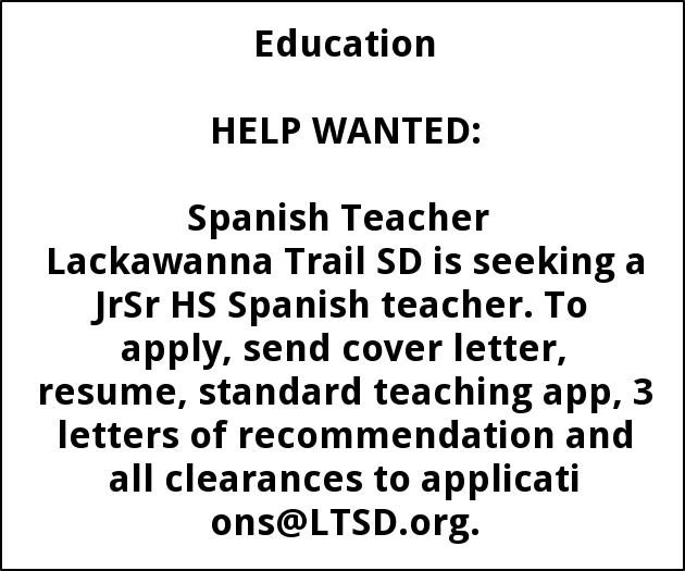 Lackawanna Trail SD is seeking a JrSr HS Spanish teacher. To apply, send cover letter, resume, standard teaching app, 3 letters of recommendation and all clearances to applicati ons@LTSD.org.